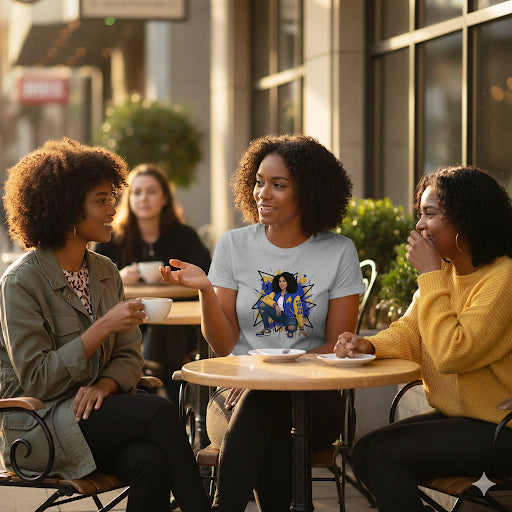 This polished SGRho design transforms your favorite Capitol Chic character into wearable art. Deeper blues, richer golds, and a look that’s instantly Rhoyal.